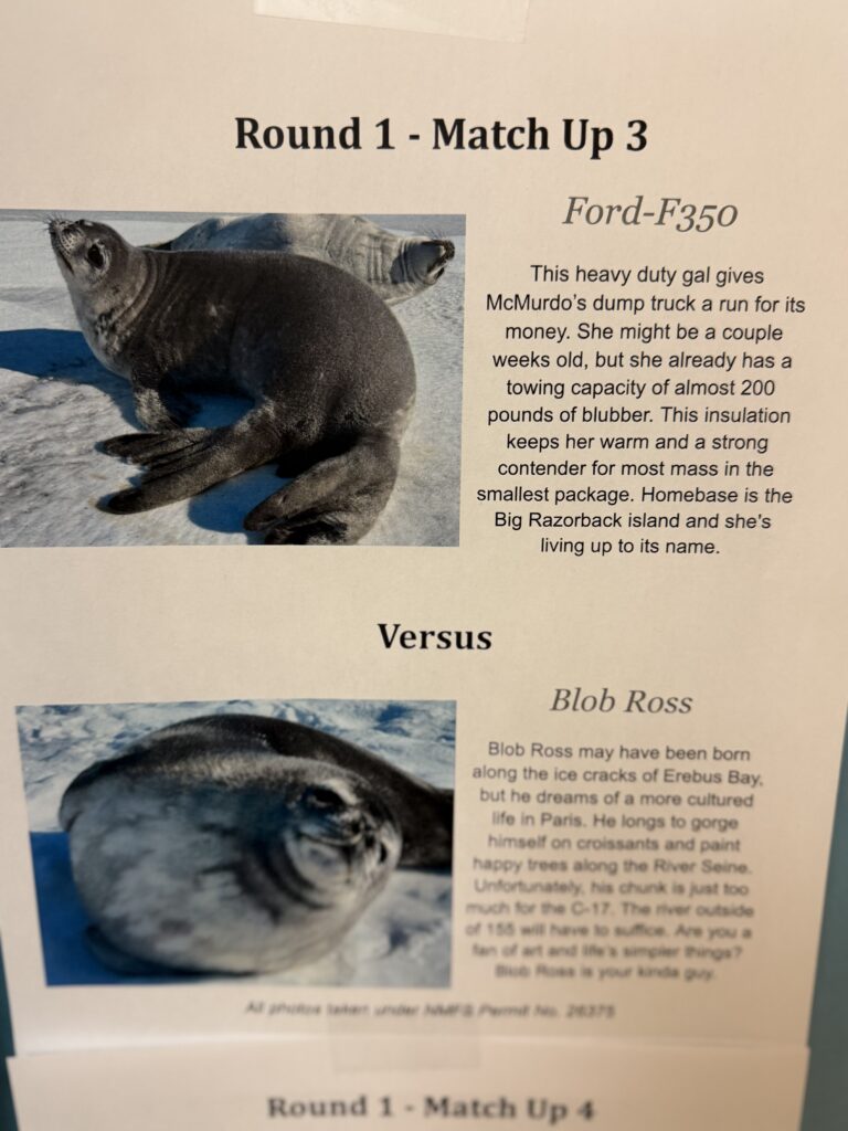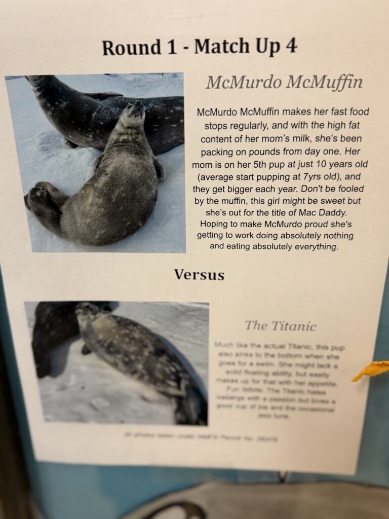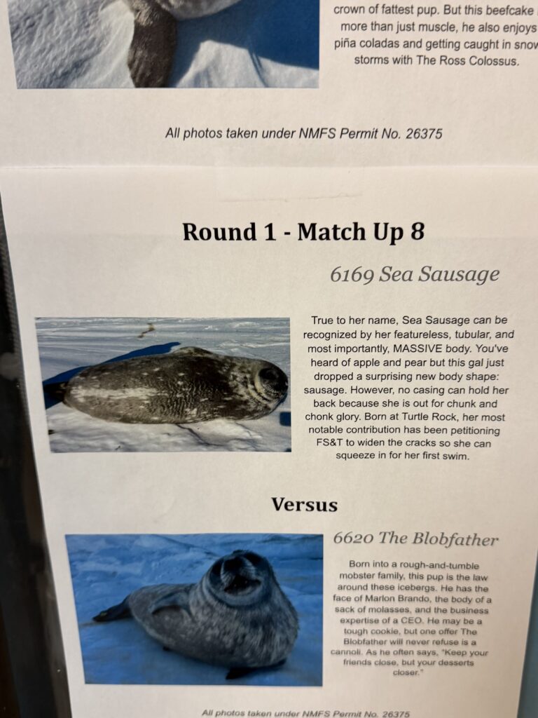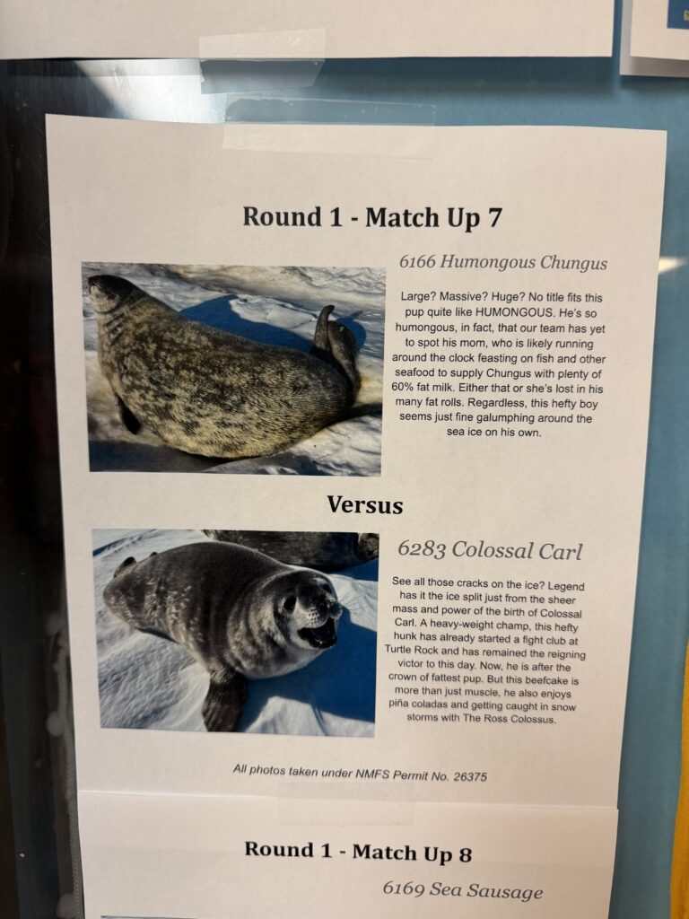 Other fun things of the week included “Fat Seal Pup” Week. There’s a science group out here studying the Wendell Seals and their new pups, as it’s currently pupping season. While they already named and tagged them, they’re having us vote on our favorites. Check out the cute bios they posted.