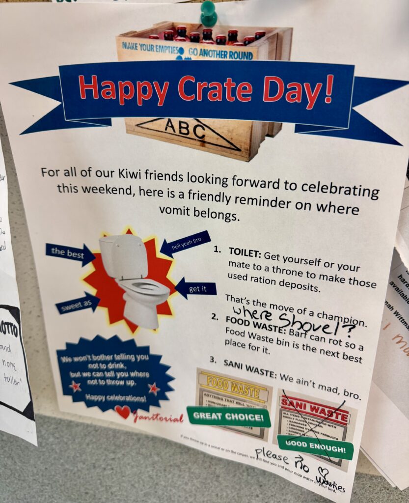 Crate Day in New Zealand began in 2010 and was promoted by a radio station called “The Rock”. The idea was to celebrate the start of summer by sharing a crate of beer with friends. This event quickly gained popularity and became an unofficial national holiday. Our fine “janos” here posted a reminder that puke belongs in the Food Waste bin, not the urinal or other locations on stations of years past.